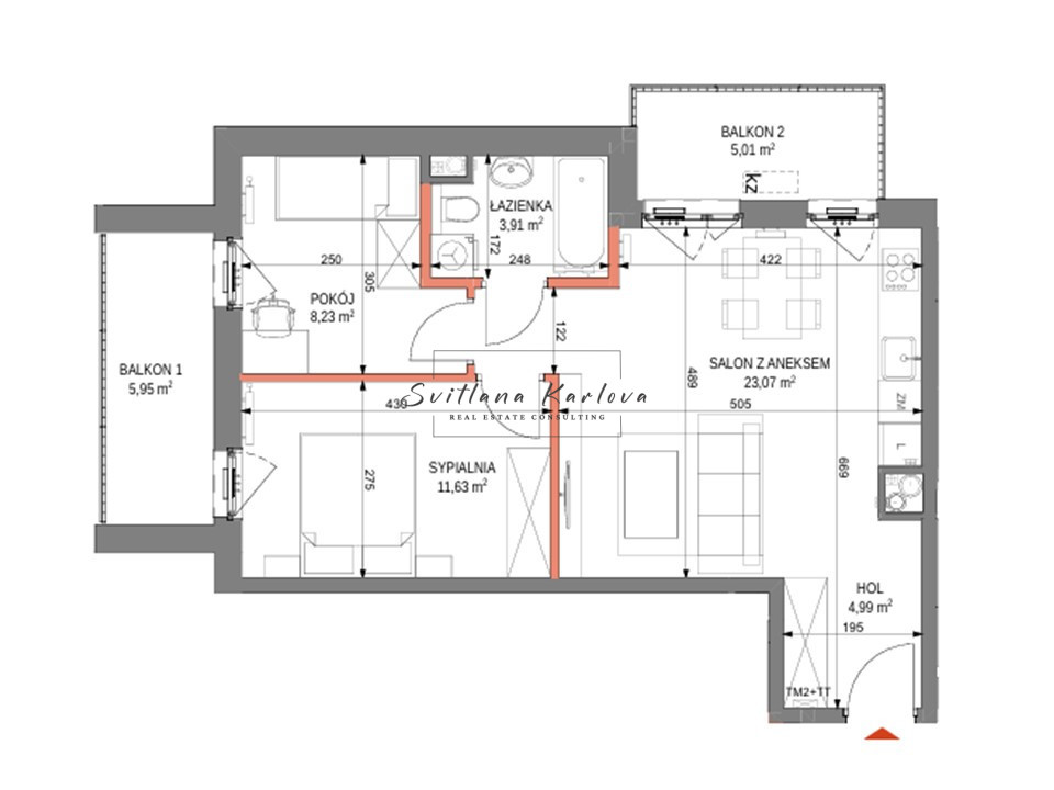 - Salon z aneksem kuchennym - 23,07m2 z wejściem do balkonu 5,00 m2