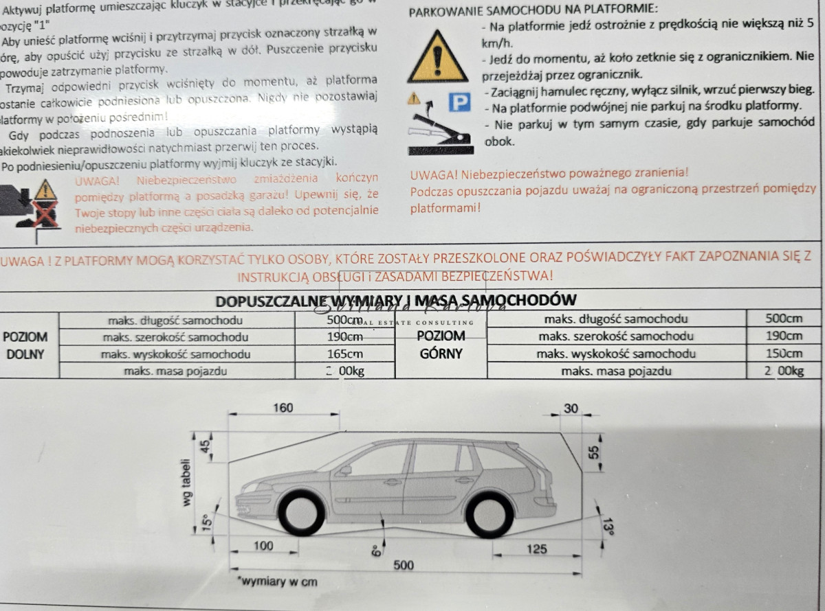 - Miejsce postojowe na platformie górnej w garażu - 200zł (Możliwość wynajęcia od sąsiadów miejsca parkingowego w garażu na duży samochód za dodatkową opłatą).