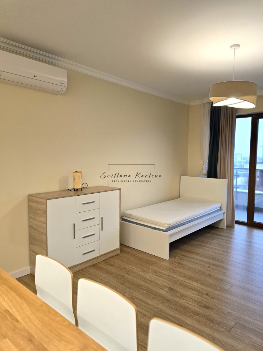 Strefa wypoczynkowa: pojedyncze łóżko, duża komoda, rozkładana sofa;